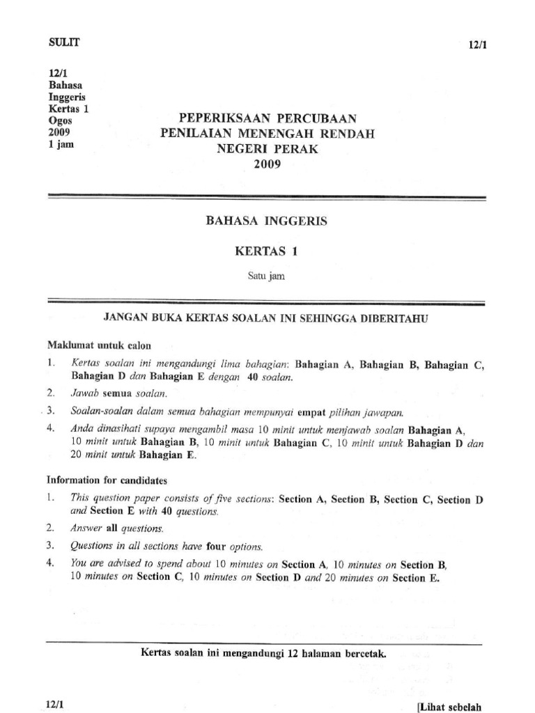 Bahasa Inggeris P1 Trial Pmr Perak 2009