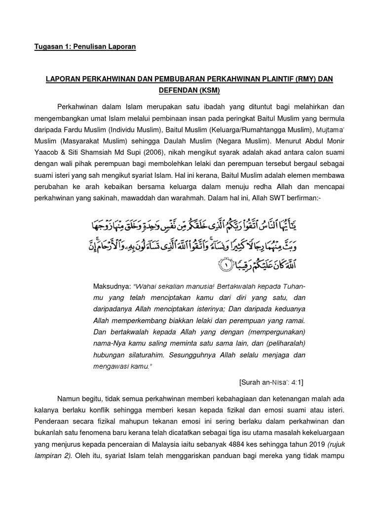 Tugasan 1 Laporan Perkahwinan Dan Pembubaran Perkahwinan Plaintif Rmy Dan Defendan Ksm