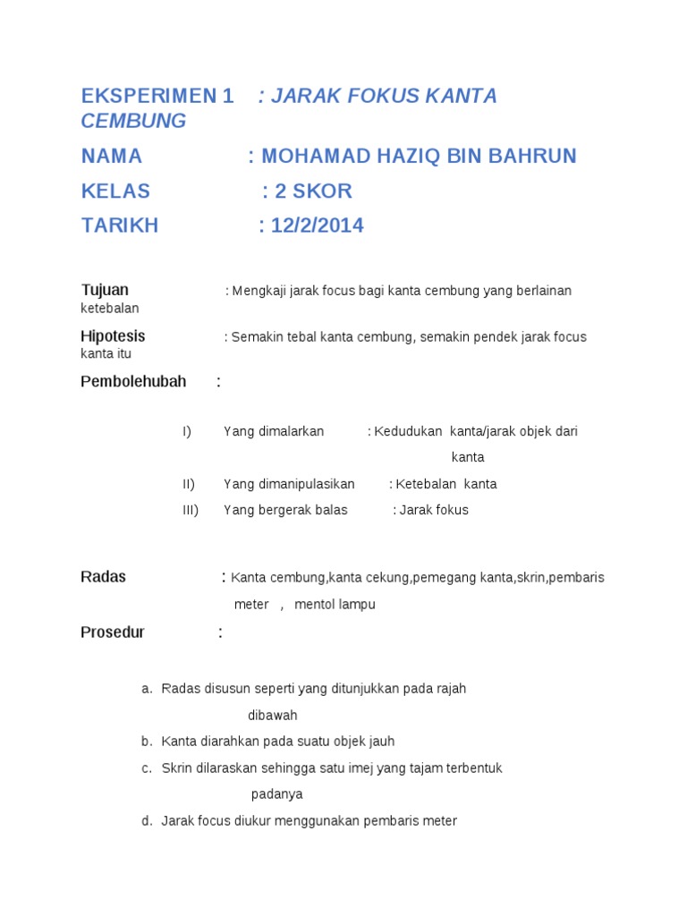 Eksperimen 1 Cembung Nama Kelas Tarikh