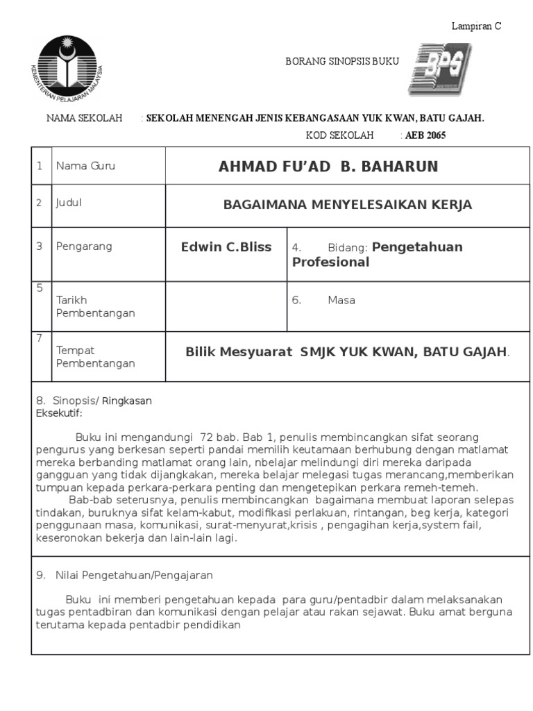 Doc Lampiran C Borang Sinopsis Buku Lizawati Masroni Academia Edu