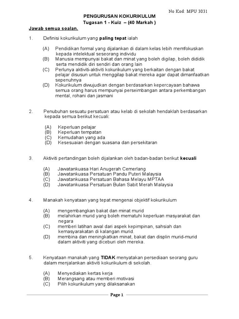 Kertas Soalan Pengurusan Kokurikulum Mpu3031