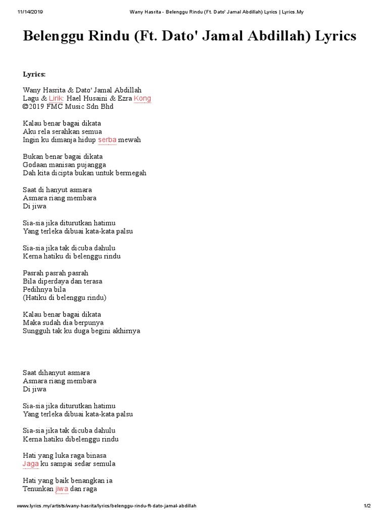 Lirik Lagu Belenggu Rindu Wany Hasrita Dato Jamal Abdillah 2019 Encikshino Com