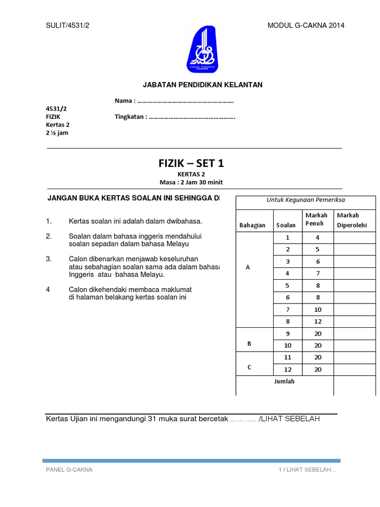 Modul Fizik Cakna Kelantan Spm 2014 K1 Set 1 Dan Skema