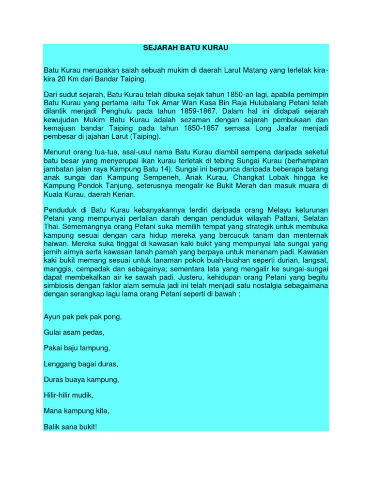 Sejarah Batu Kurau Docx Sejarah Batu Kurau Batu Kurau Merupakan Salah Sebuah Mukim Di Daerah Larut Matang Yang Terletak Kira Kira 20 Km Dari Bandar Course Hero