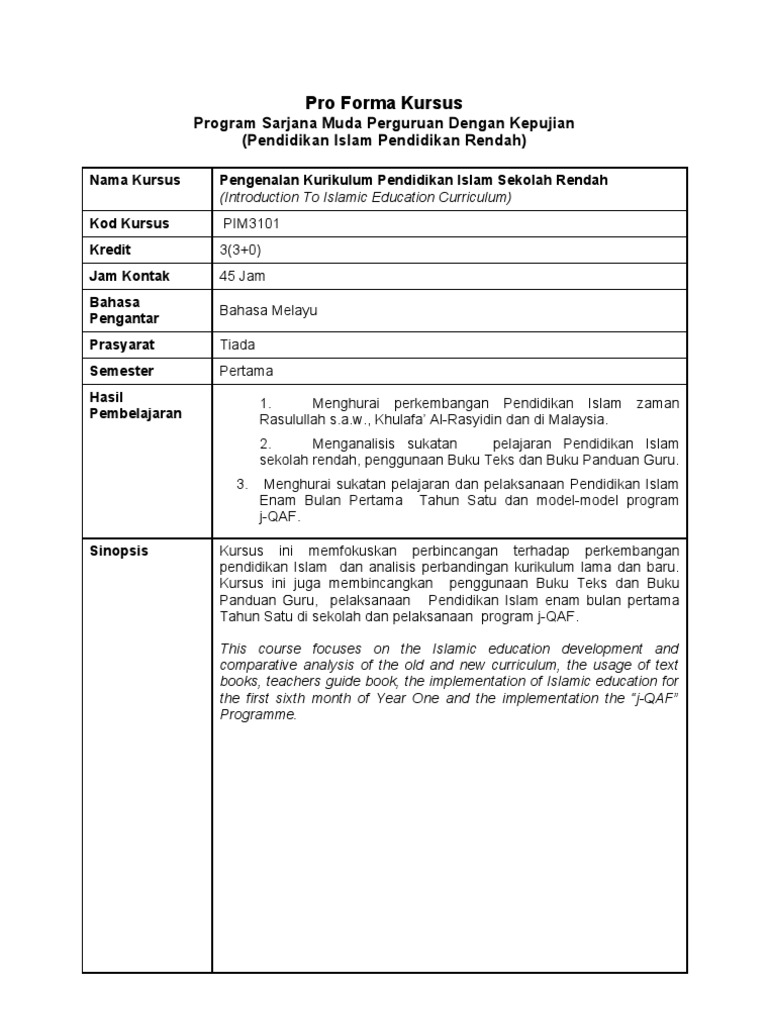 Pro Forma Kursus Program Sarjana Muda Perguruan Dengan Kepujian Pendidikan Islam Pendidikan Rendah