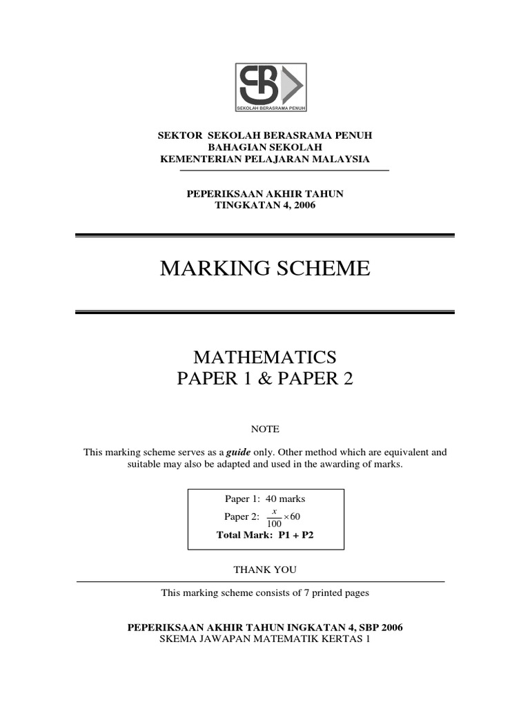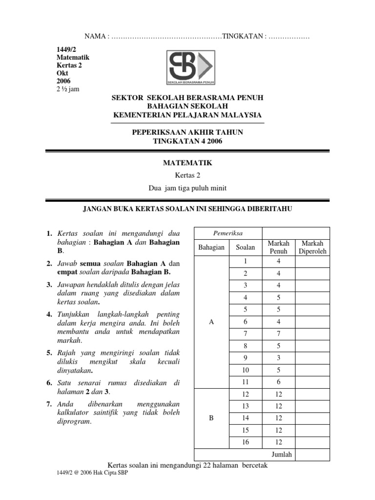 Kertas Soalan Matematik Sbp Tingkatan 4 Jawapan