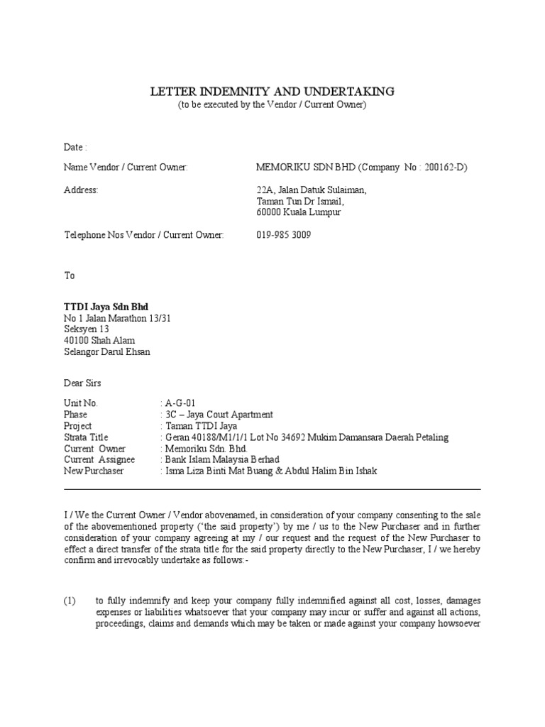 Letter Of Indemnity And Undertaking Vendor Indemnity Malaysia