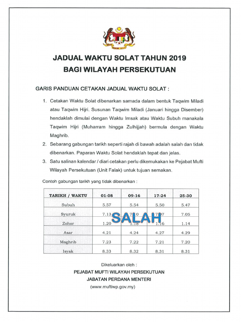 Jadual Waktu Solat Wpklptj 2019 Pdf